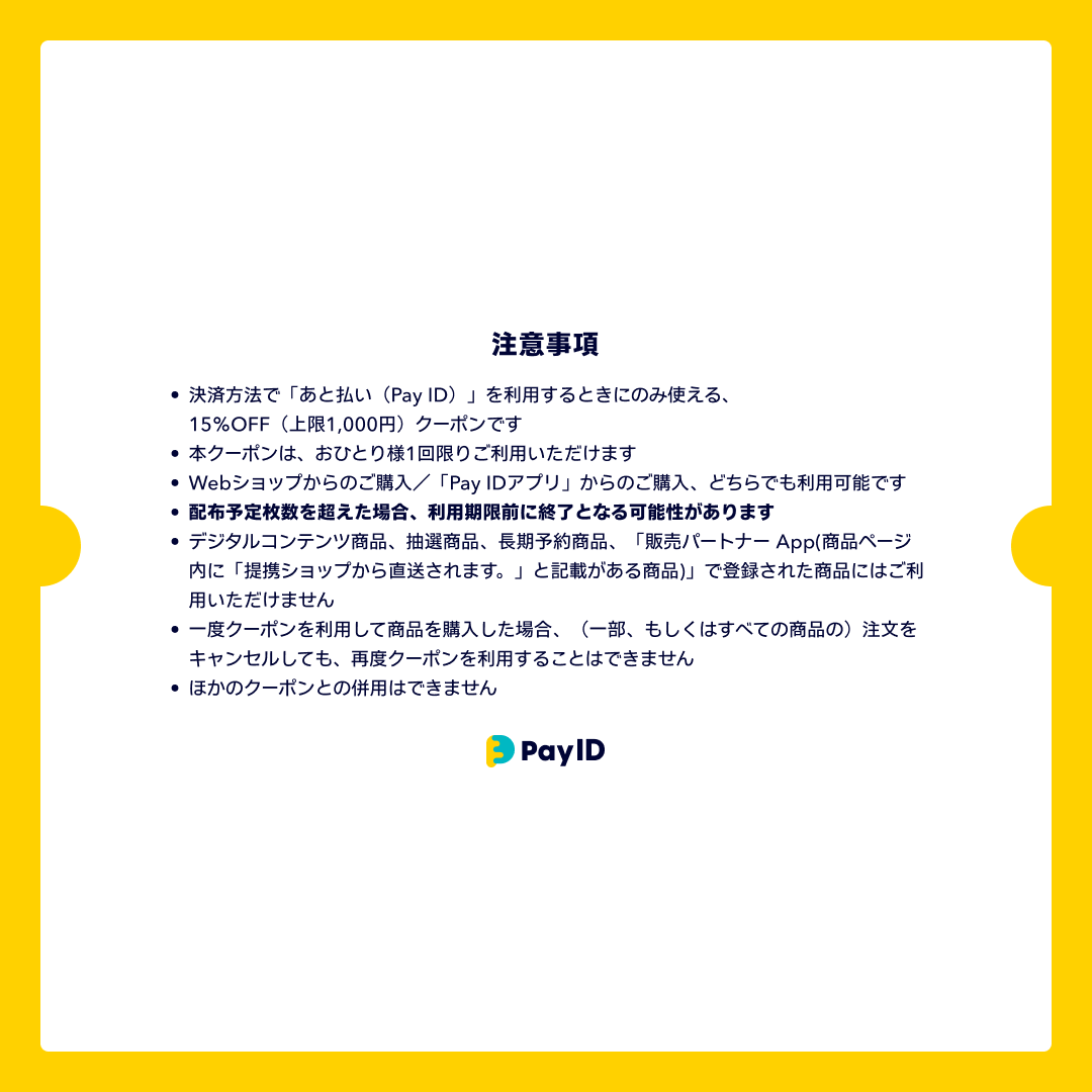 「あと払い(Pay ID)」でのお支払いで、15%OFFクーポン(上限1000円)がその場で使える!
